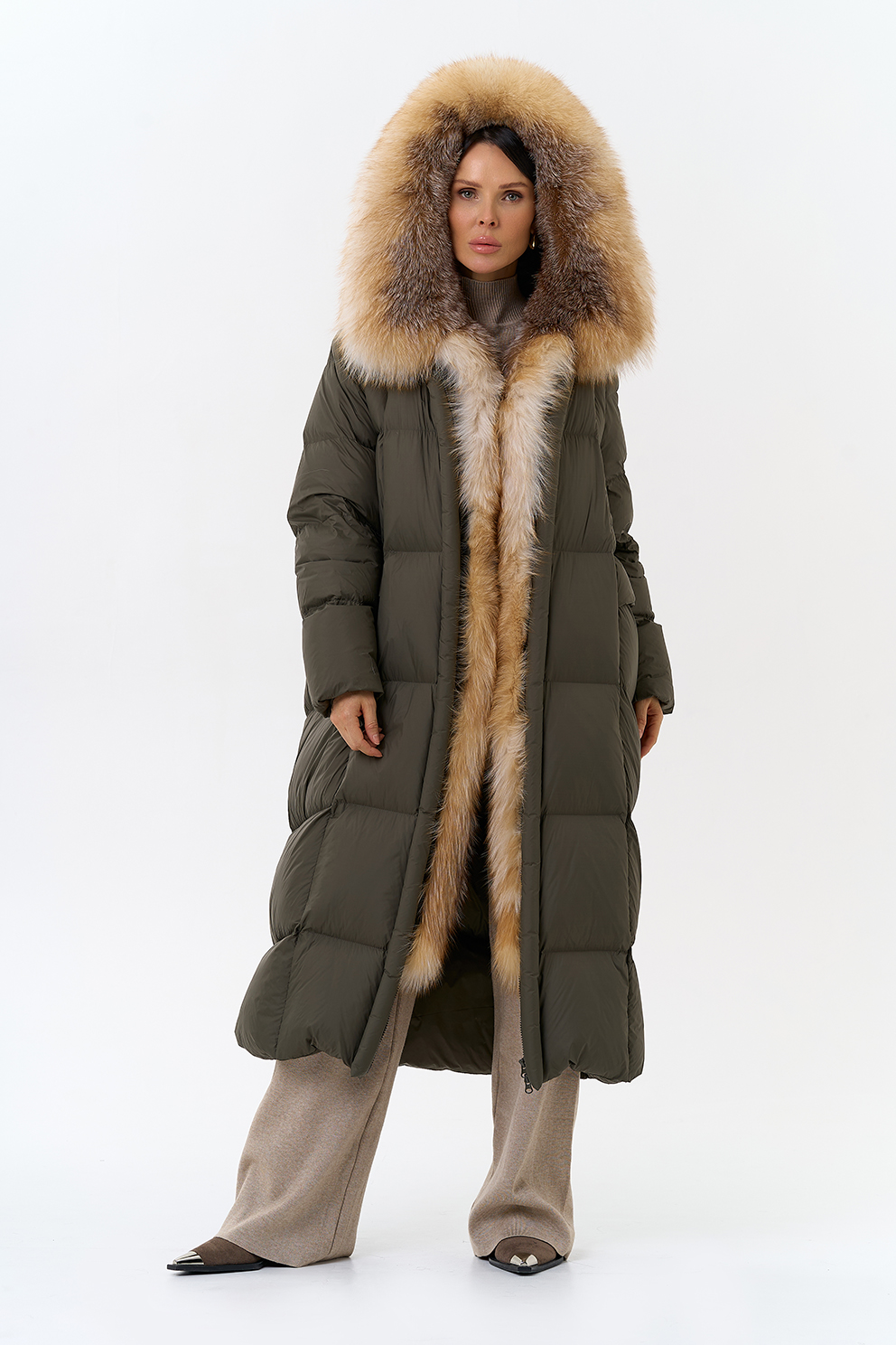 Крой воротника - капюшон, отделка лиса рыжая