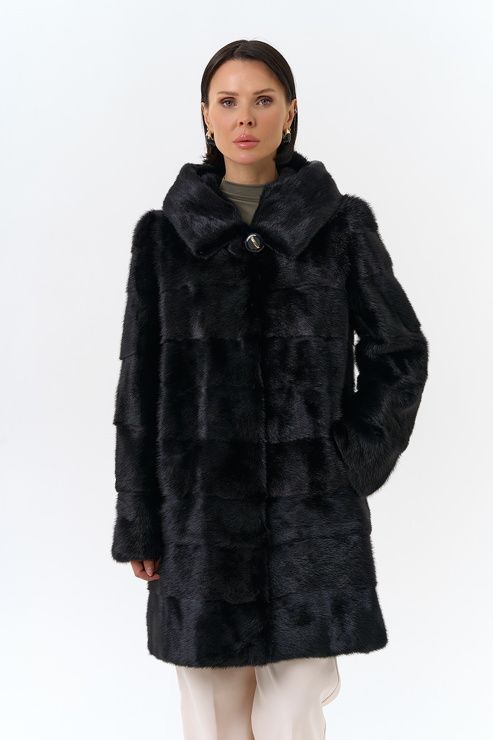 Шуба поперечной раскладки в черном цвете из меха норки.