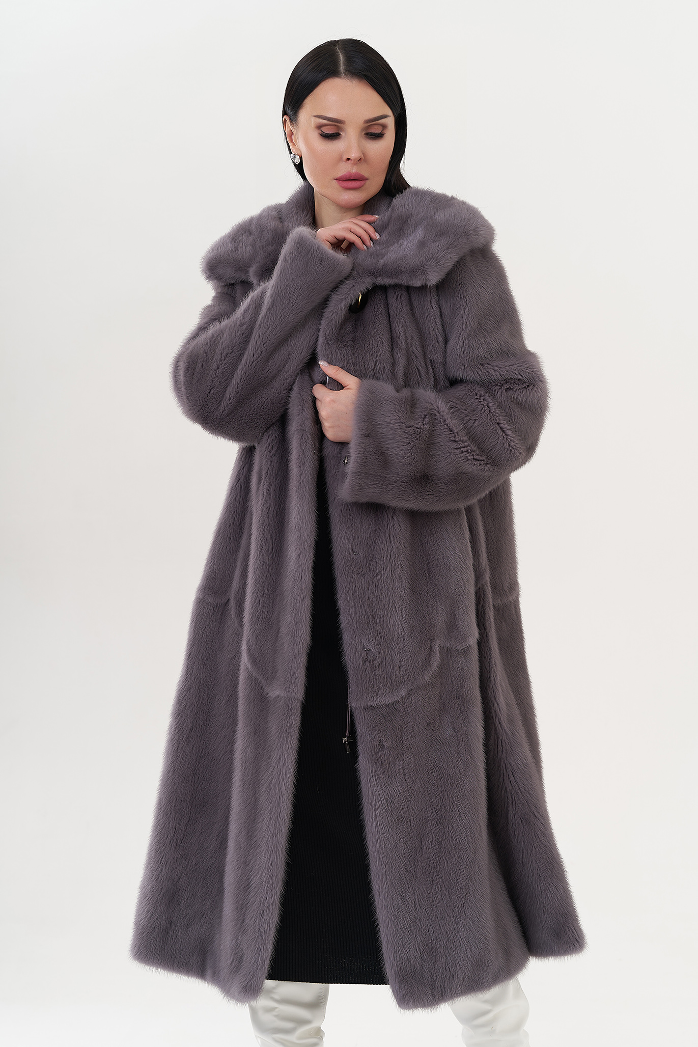 Норковая шуба с капюшоном в фиолетовом цвете.